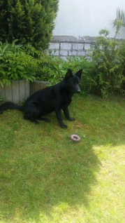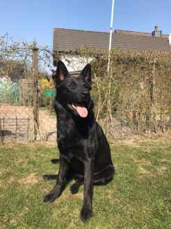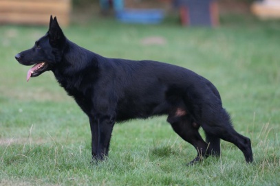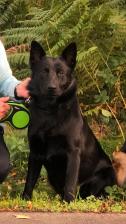 Gesamturteil: An der oberen Größengrenze stehende, schwarze, kräftige, gehaltvolle, gestreckte Hündin mit gutem Widerrist, leichtem Knick dahinter und kurzer Kruppe von guter Lage. Gute Winkelungen, ausgeglichene Brustverhältnisse, gerade Front. Geradetretend zeigt sie flüssige Gänge mit gutem Raumgewinn. Sicheres Wesen, TSB ausgeprägt; läßt ab.